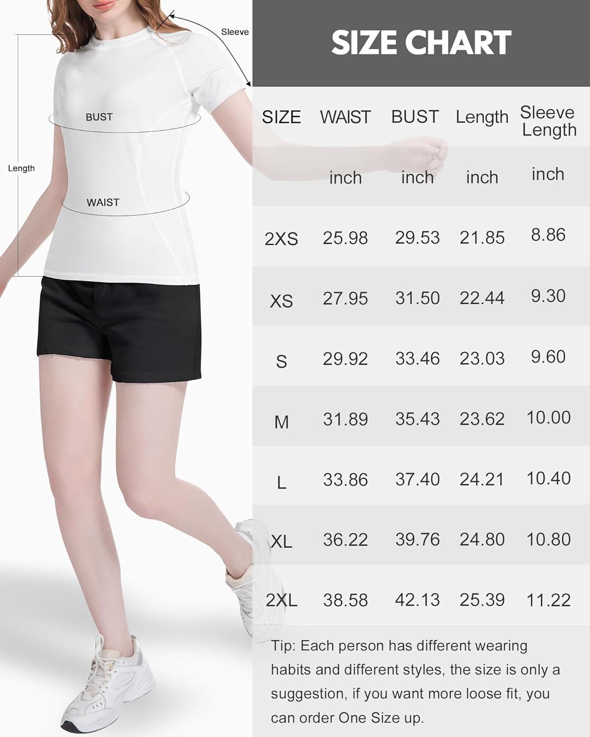 These women's compression shirts offer four-way stretch for muscle support and flexibility, enhancing recovery and performance. Made from breathable, moisture-wicking polyester and spandex, they ensure quick drying and comfort in various weather conditions. The tagless neckline prevents irritation, and the shirts come in a 4-pack, available in sizes XS to XL. Machine wash cold, hang or lay flat to dry. Ideal for workouts, yoga, and daily activities