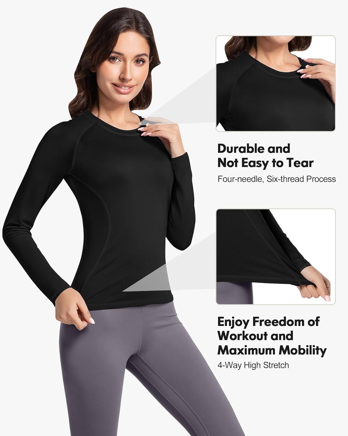 These women's compression shirts offer four-way stretch for muscle support and flexibility, enhancing recovery and performance. Made from breathable, moisture-wicking polyester and spandex, they ensure quick drying and comfort in various weather conditions. The tagless neckline prevents irritation, and the shirts come in a 4-pack, available in sizes XS to XL. Machine wash cold, hang or lay flat to dry. Ideal for workouts, yoga, and daily activities