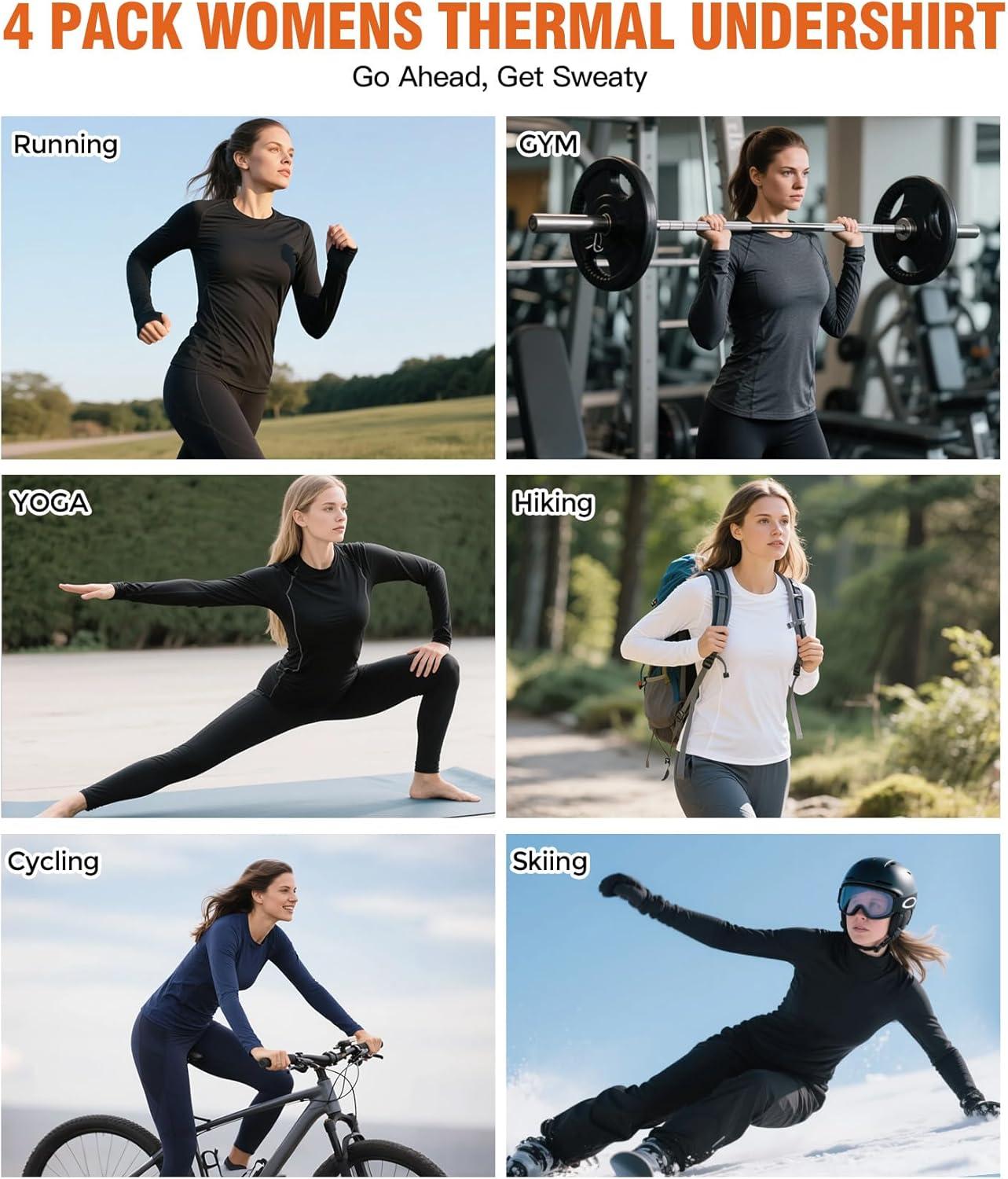 4 Pack Women’s Long Sleeve Compression Shirts, Dry Fit Workout Athletic Sun Protection Cooling Tops for Yoga Running Gym(T-2 Black/White/Heather Light Gray)