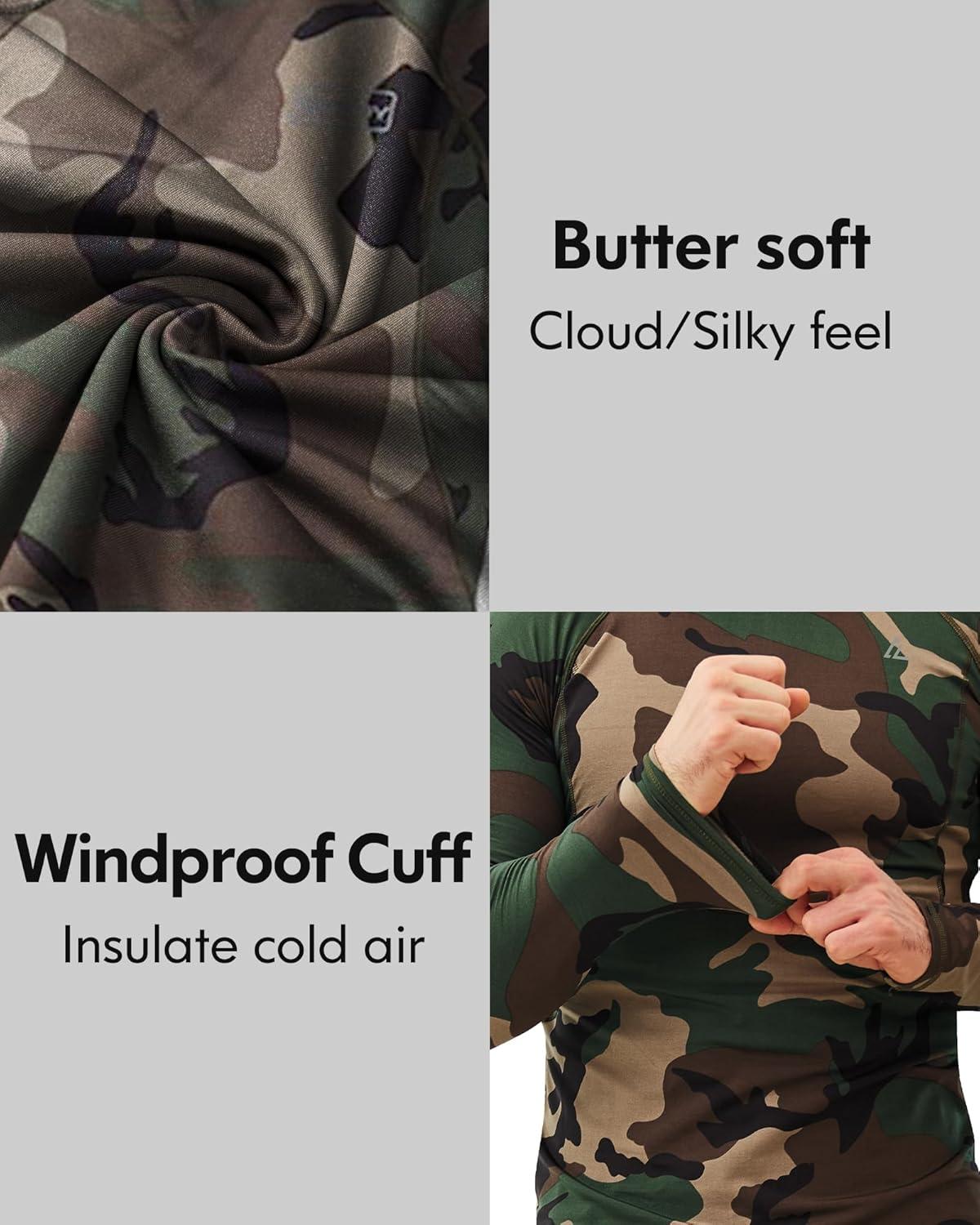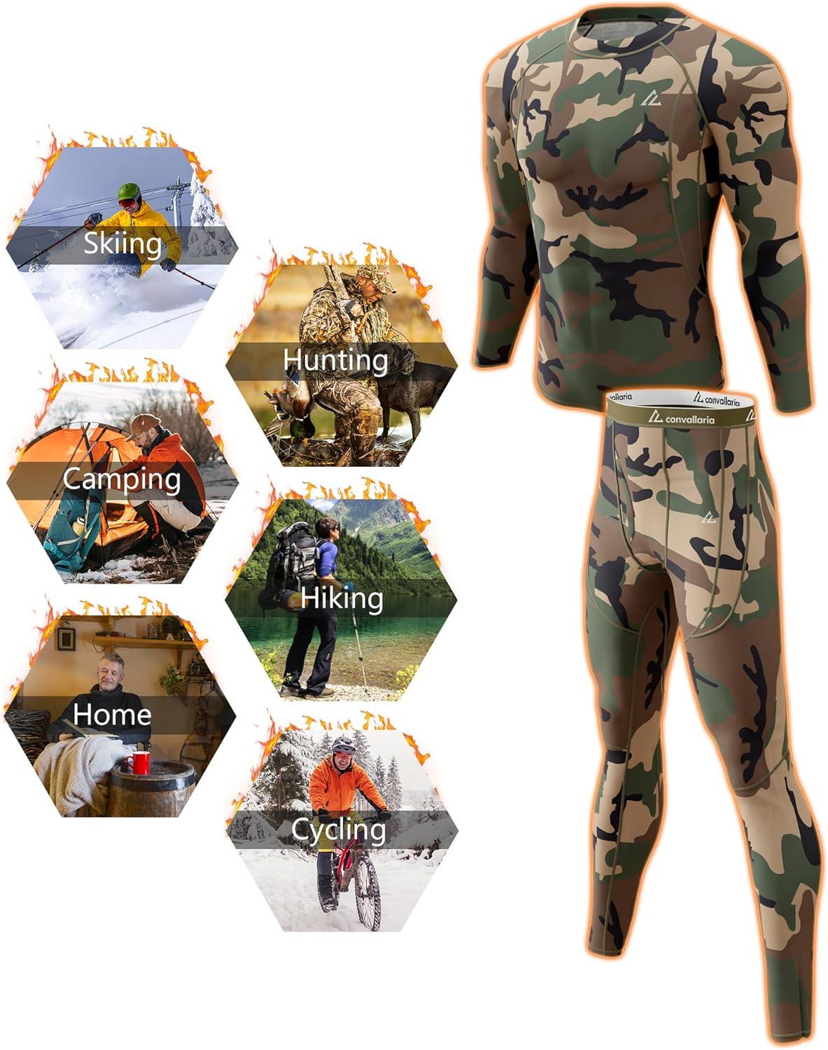 CL convallaria 2 Pack Mens Thermal Underwear Fleece Lined Long Johns Winter Base Layer Cold Weather Hunting Gear(Black & Camo Green-crew Neck)
