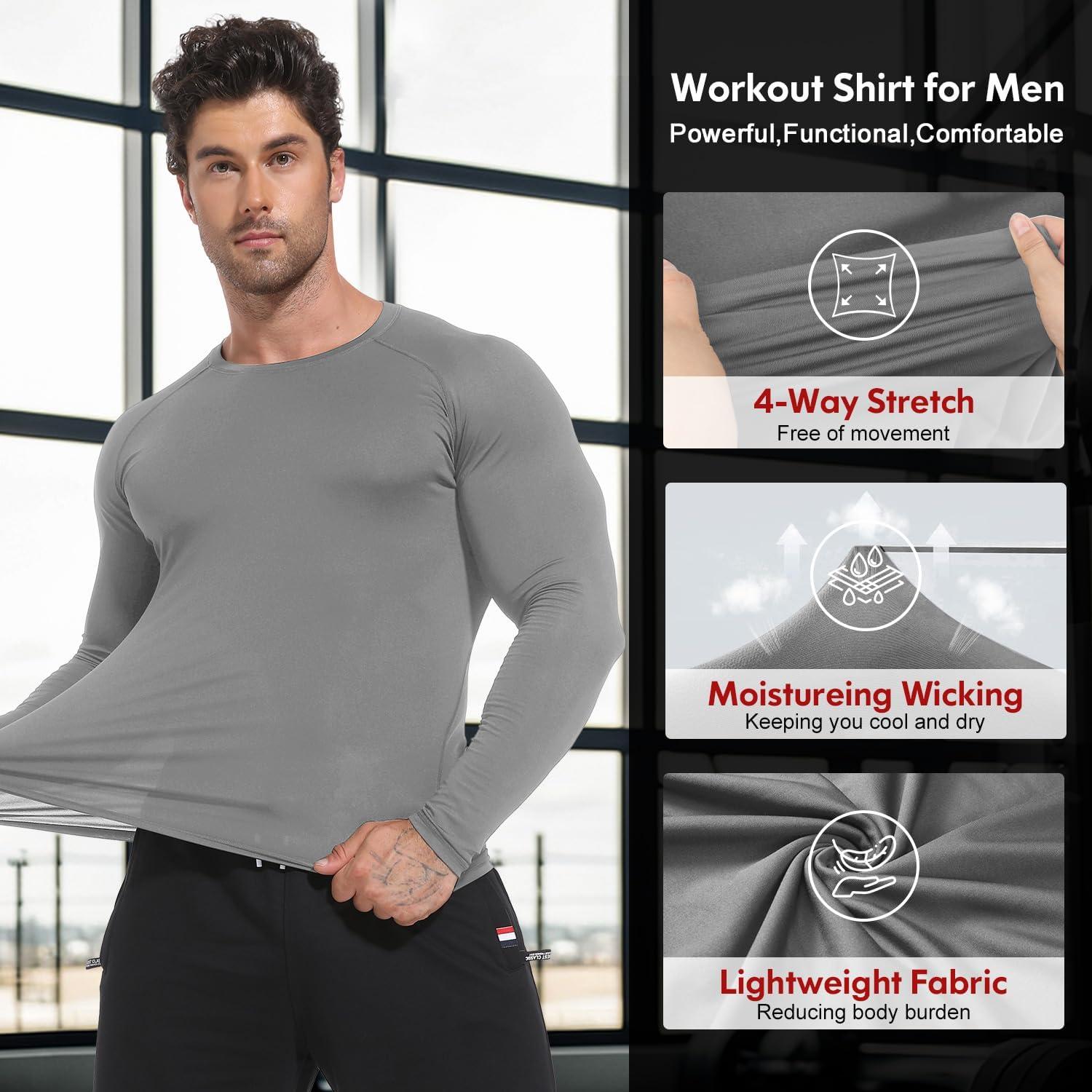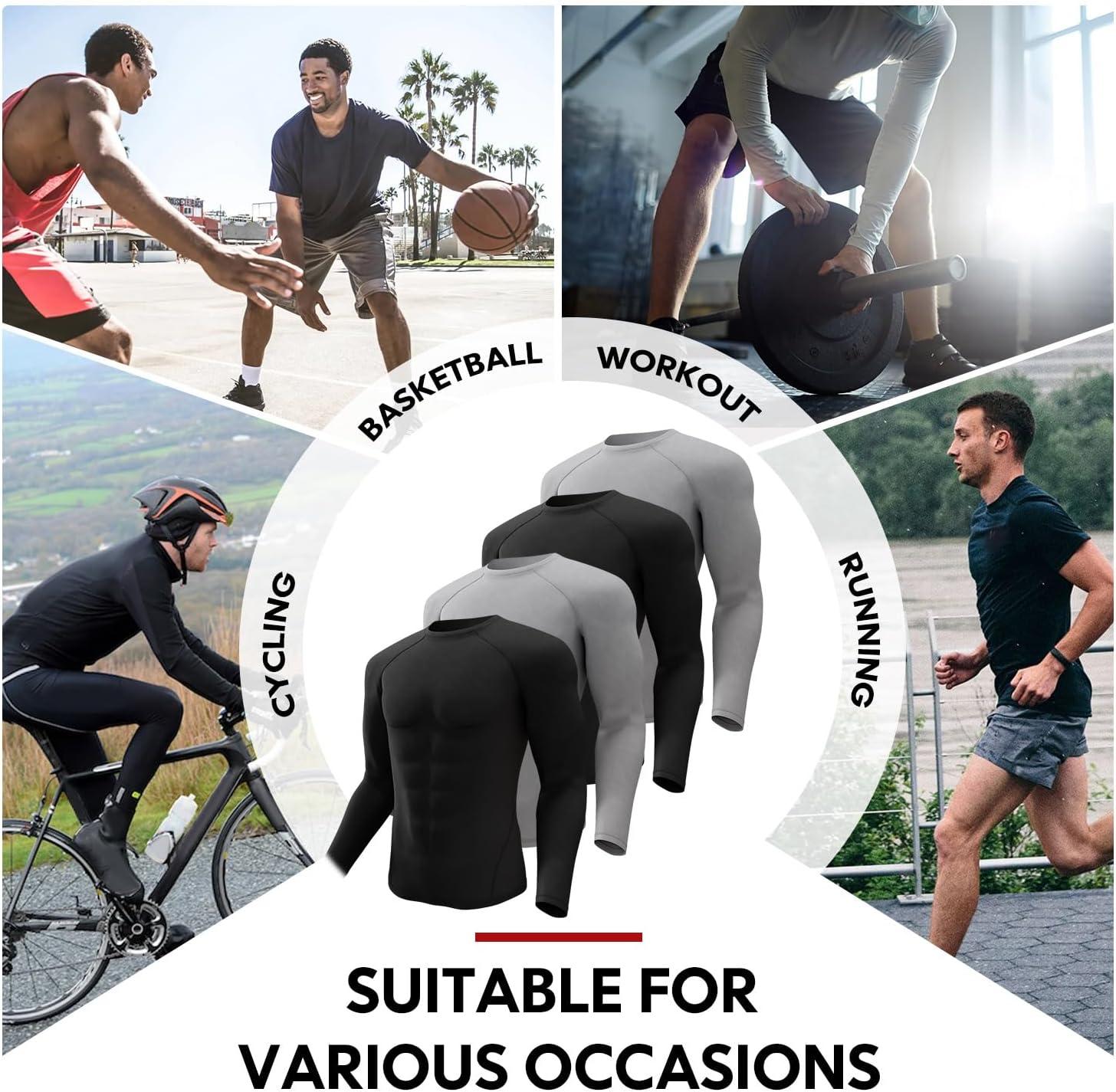 CL convallaria 4 Pack Compression Shirts Men Long Short Sleeve Cooling Dry Rash Guard Athletic Workout T Shirt for Sports(Long Sleeve-2 Black & 2 Grey)