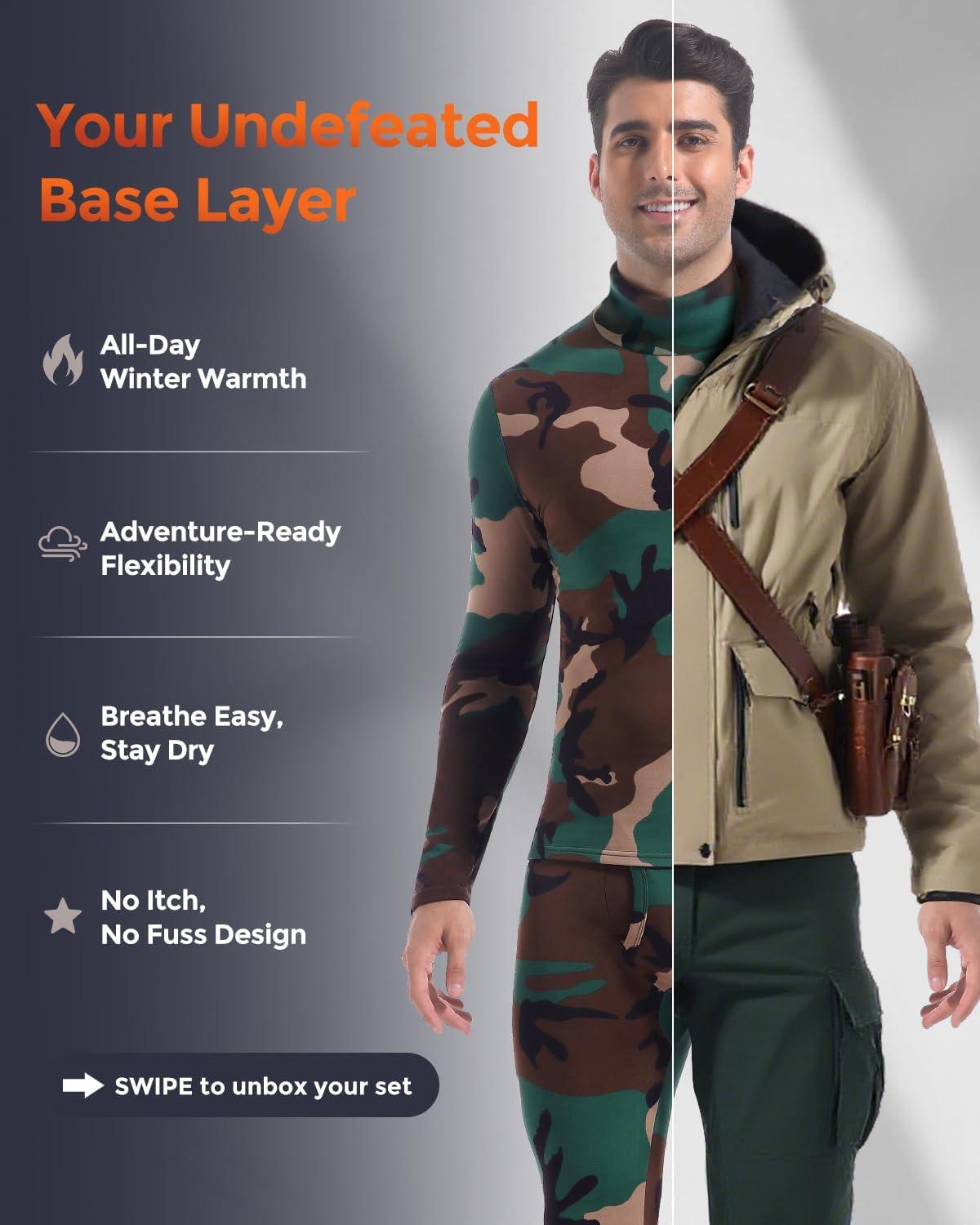 CL convallaria Long Johns Thermal Underwear for Men Soft Fleece Lined Base Layer Cold Weather Top Bottom Gift Set(Midweight-turtle Neck-camo)